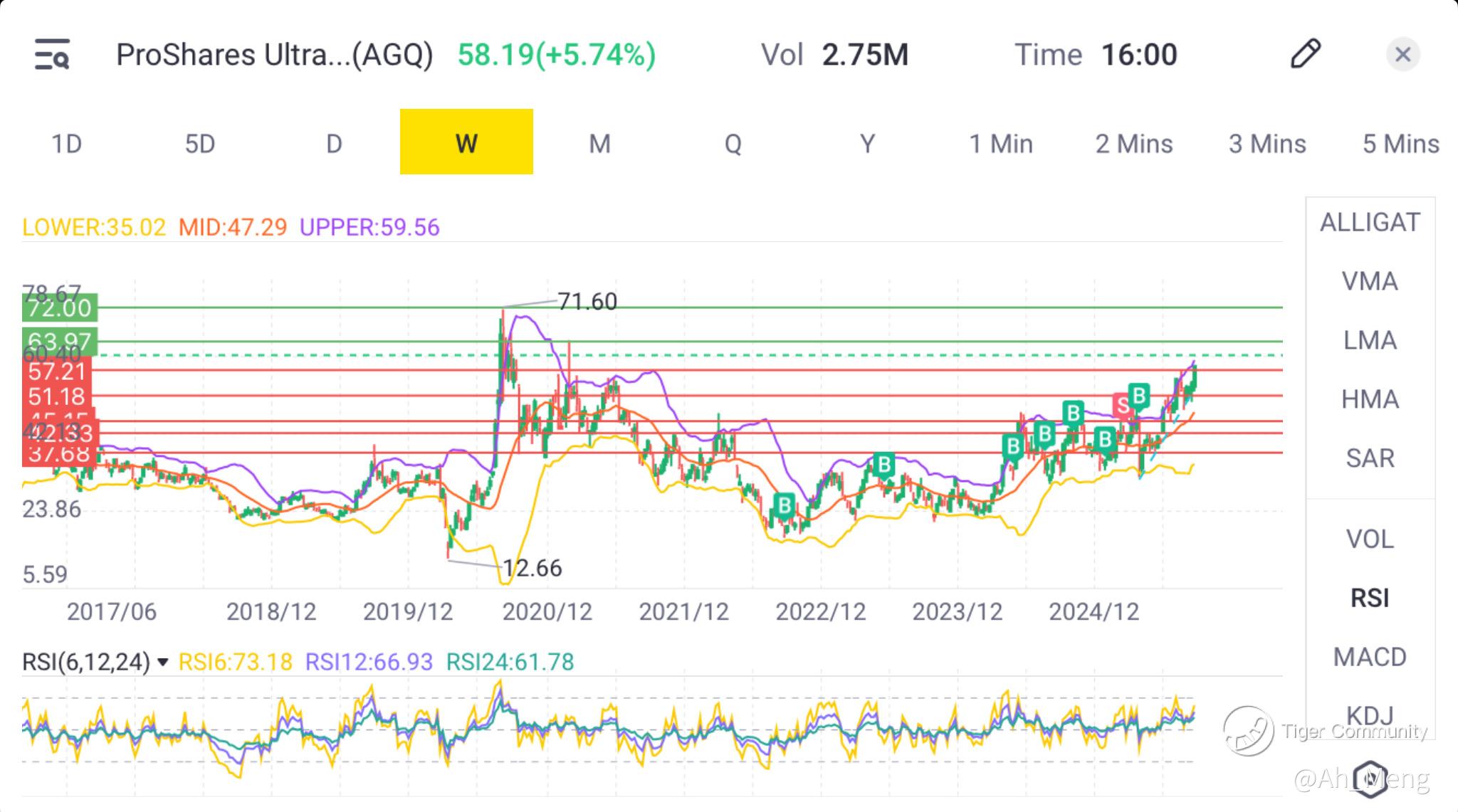 Gold is breaking new all time high... silver price is definitely gunning for $50, above its all time high price of $49.51. At least that is its short to middle term target. The next resistance for AGQ is $63, which is reachable in this rally. After that would be into the $70s, as can be seen in the weekly chart below.