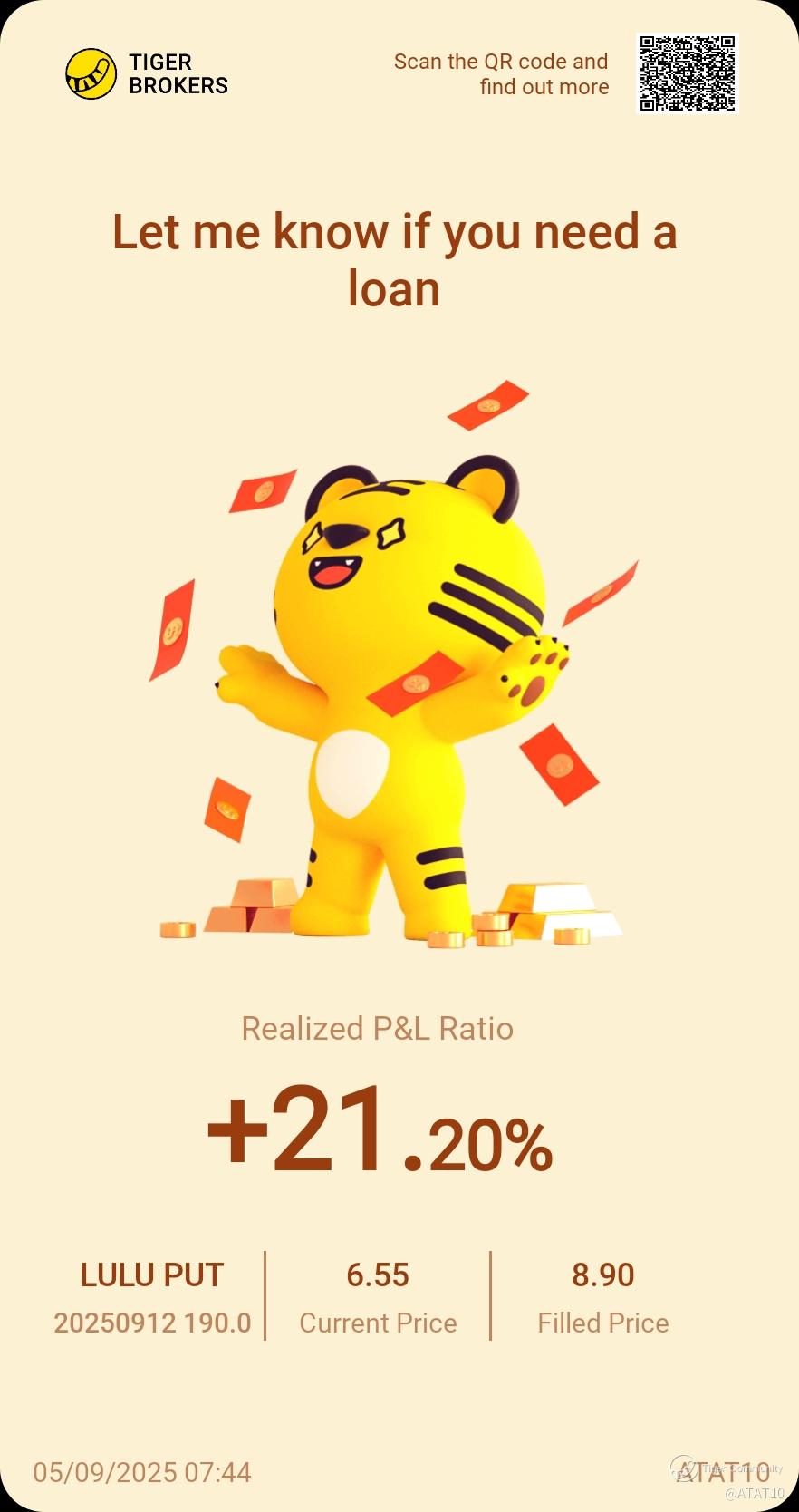 $LULU 20250912 190.0 PUT$ Lucky to close this Put with a small gain b4 results announced. Investors were disappointed with results & sold off the shares after market hours. Else got to pick this up or take the losses. đ