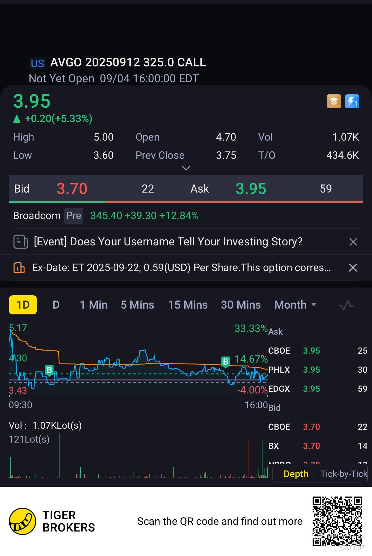 $AVGO 20250912 325.0 CALL$ bought last night just before earning is announced, my best ever last minute decision after study it patterns[Miser]