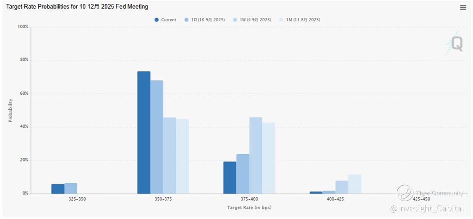 Aggressive rate-cut bets have fueled a broad rally: the S&P 500 $S&P 500(.SPX)$ and Nasdaq $NASDAQ(.IXIC)$ are both up around 1.6% this week, the Dow $Dow Jones(.DJI)$ gained 1.5%, and all three indexes hit record highs. Gold $ETFS Physical Gold(GOLD.AU)$ , which already made fresh highs last week, added nearly 2% more. Bitcoin $iShares Bitcoin Trust ETF(IBIT)$ bounced 3.6%. The dollar index, meanwhile, has pulled back sharply.