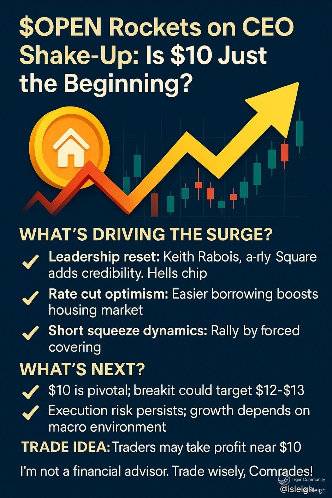 Opendoor ($OPEN) surged over 50% after announcing a major leadership shift—naming a new CEO and appointing veteran tech executive Keith Rabois as chairman. This move, widely seen as a vote of confidence from Silicon Valley, reignited investor interest in the real estate tech disruptor, pushing the stock to $9.17 and drawing attention to the next psychological resistance at $10.