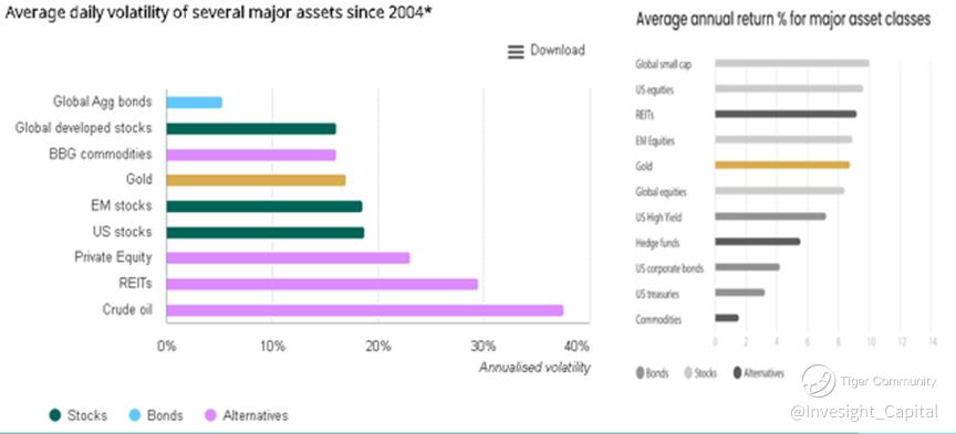 This reflects gold’s evolving role as a portfolio stabilizer — essentially the “anchor” for risk assets like equities. Its lower volatility compared to equities (see left chart: volatility comparison across asset classes) and relatively stable annualized returns (right chart) make it increasingly attractive as a core portfolio allocation.