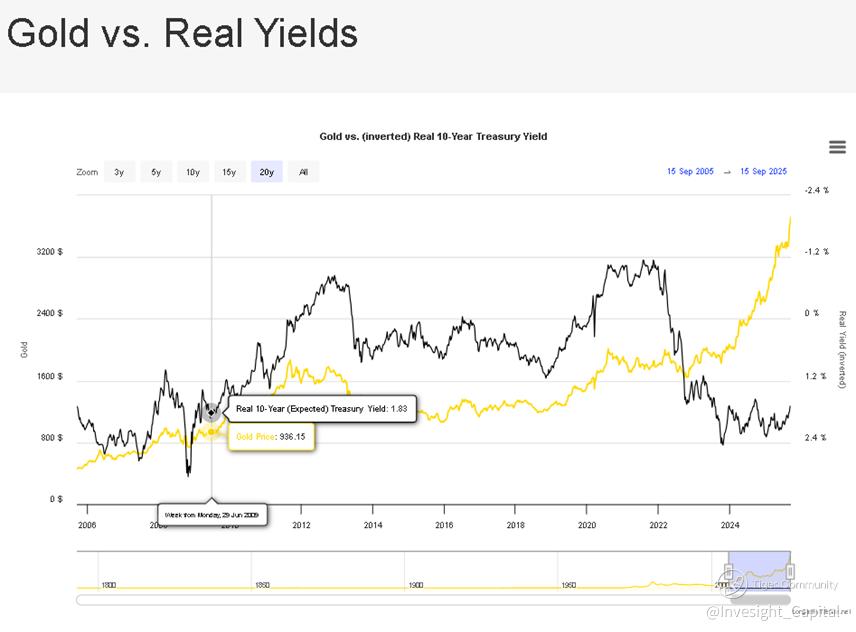 Finally, the early-September U.K. gilt market “meltdown” spread to global bond markets, shaking investor confidence in governments’ ability to service long-term debt given surging debt-to-GDP ratios. This made gold look more attractive relative to Treasuries. Since late 2022, when inflation peaked, gold’s real yield has outperformed 10-year Treasuries, further tilting investor preference toward gold.