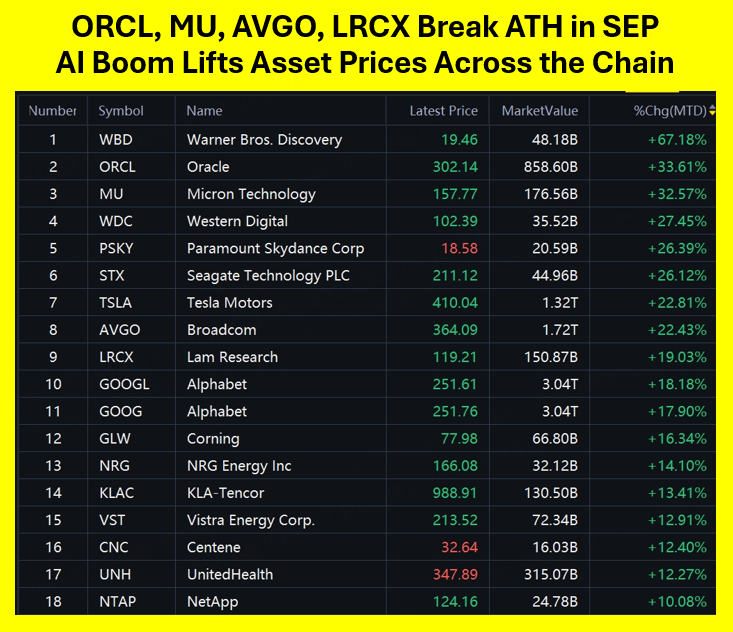 Ten of those winners are simultaneously carving all-time records: $Oracle(ORCL)$ , $Micron Technology(MU)$, $Paramount Skydance Corp(PSKY)$ , $Broadcom(AVGO)$ , $Seagate Technology PLC(STX)$ , $Lam Research(LRCX)$ , $Alphabet(GOOG)$ , $Corning(GLW)$ , $KLA-Tencor(KLAC)$ and $Vistra Energy Corp.(VST)$.