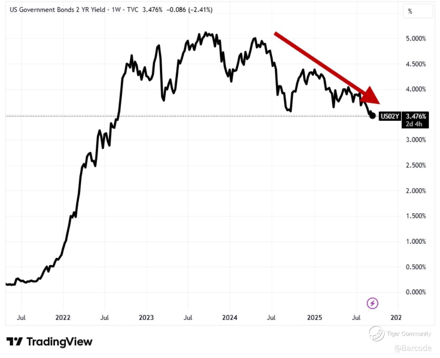 The TradingView chart on US 2Y yields shows a decisive dump to 3.476%, the lowest in three years. The 10Y visual confirms yields breaking under 4% and nearing last week’s trough.
