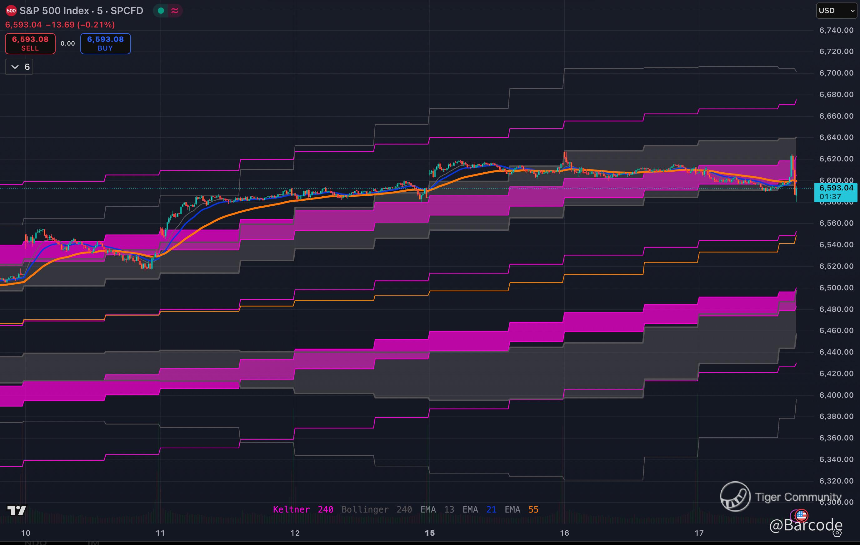 SPX Keltner and Bollinger band overlays demonstrate compression unwinding with volatility expansion potential.
