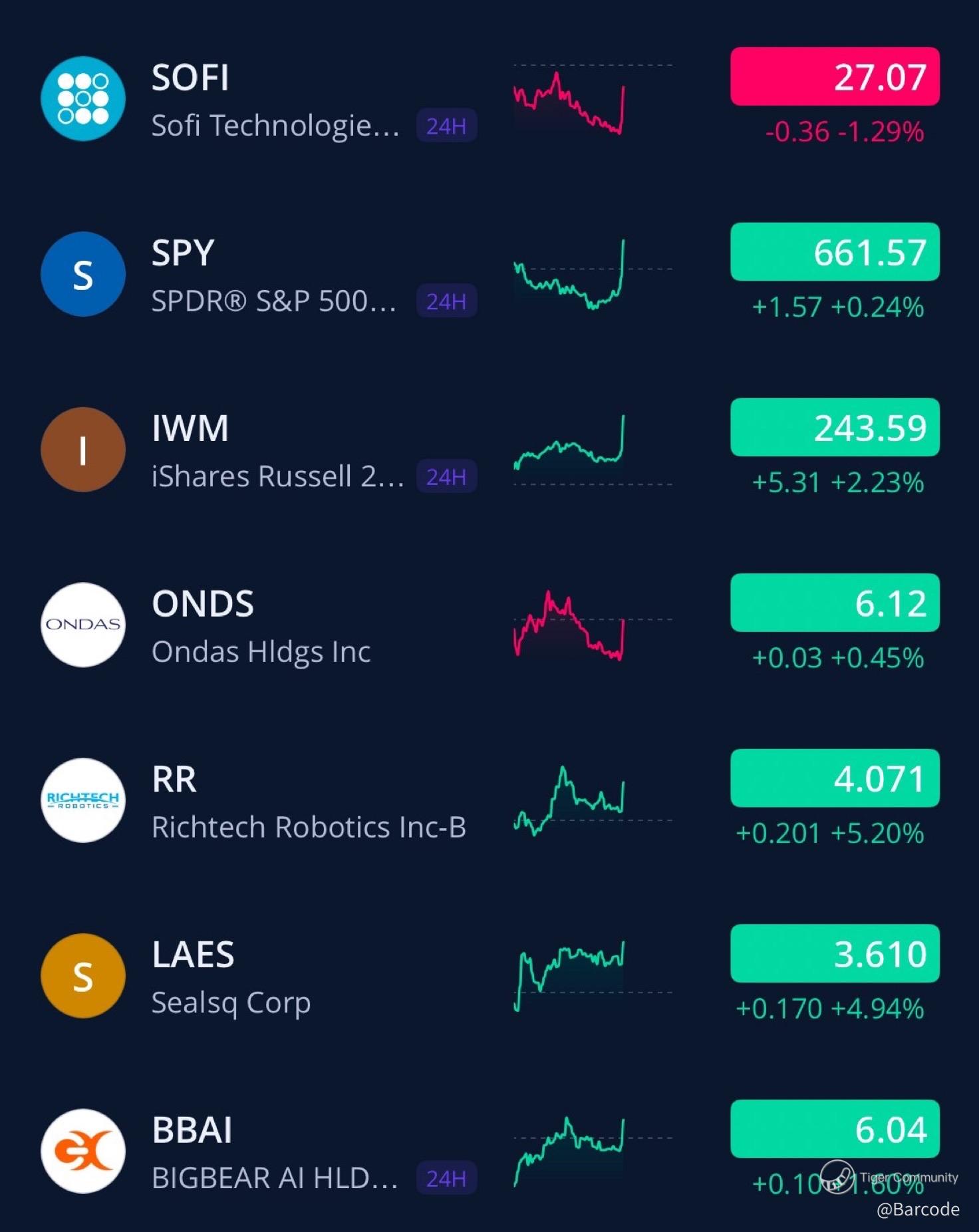 Speculative AI/robotics names highlighted on your scatter visual ripped higher: $RR +5.20%, $LAES +4.94%, $BBAI +1.60%, $ONDS +0.45%.