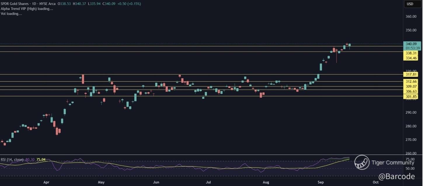 The $GLD candlestick chart shows a clean breakout to $340.09 with RSI above 75. Momentum is confirmed on the technical overlay. Commodities positioning visuals indicate a building case for a supercycle if DXY weakness persists.