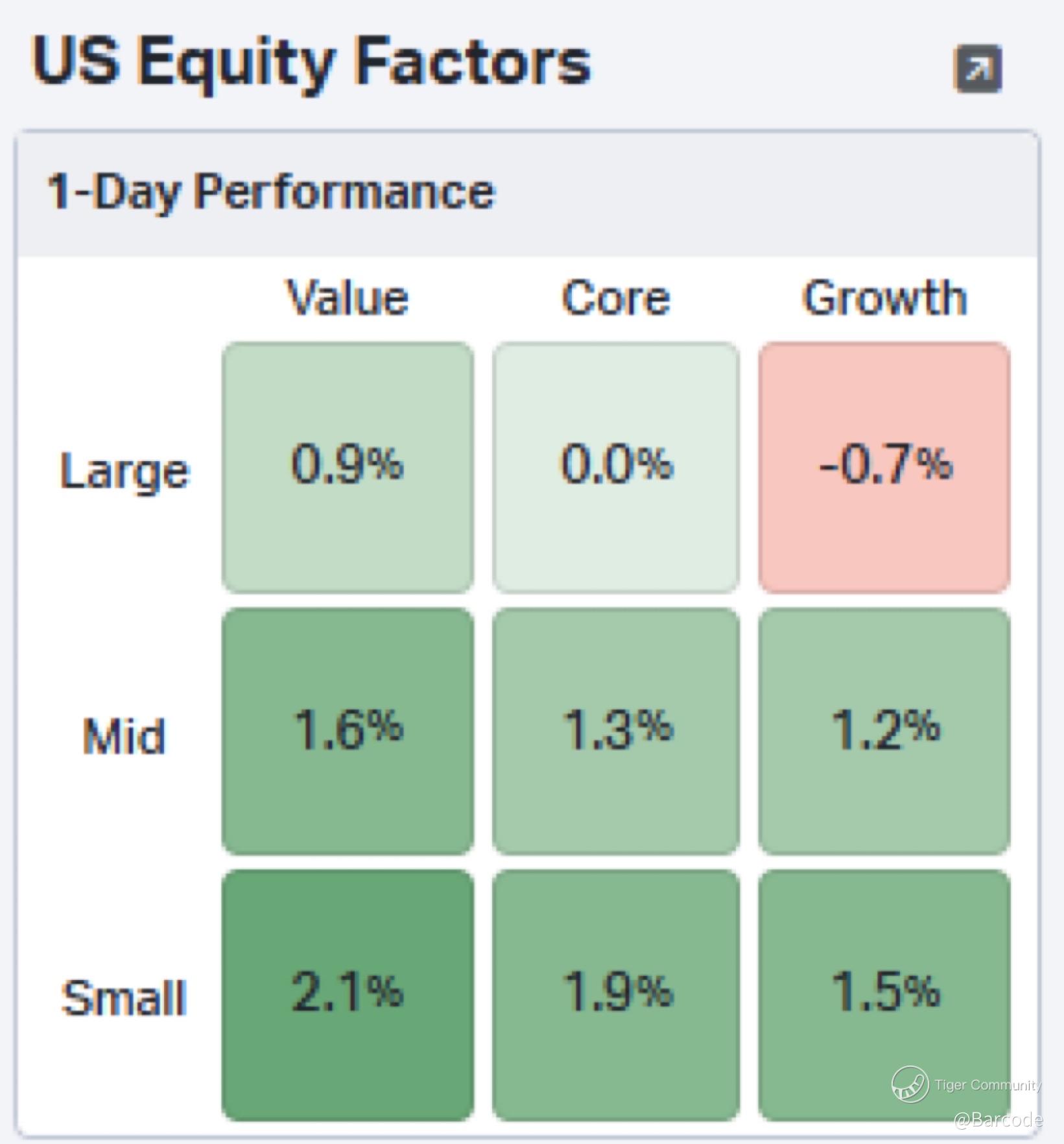 The US Equity Factors heat map clearly shows small-cap value as the epicenter of the bullish response: +2.1% (mid-cap +1.6%), while large-cap growth underperformed –0.7%.
