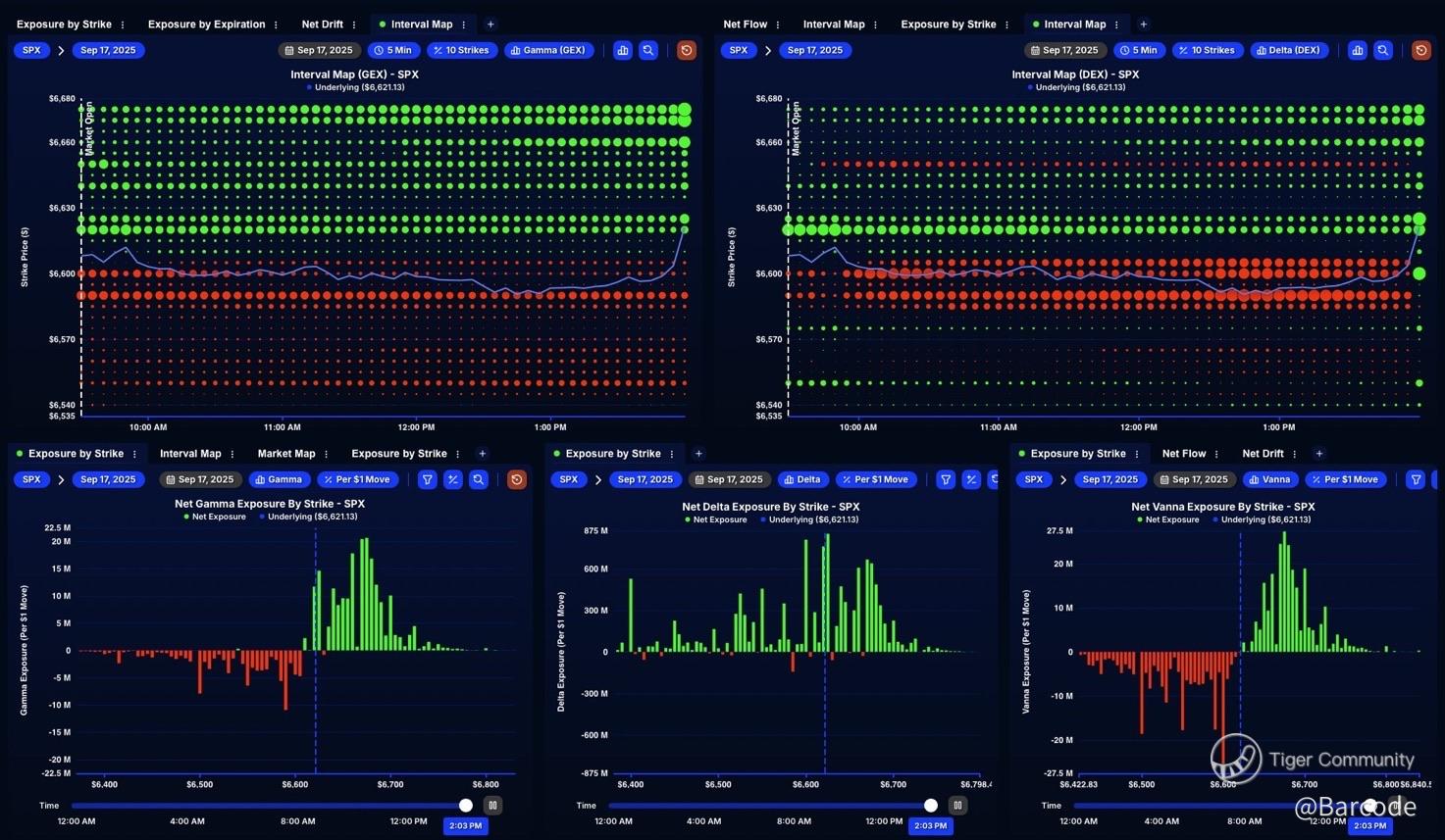 The SPX gamma exposure (GEX) and delta exposure (DEX) interval charts show sharp collapses in downside hedging walls. Net Vanna exposure visuals confirm less put intensity, freeing directional upside.