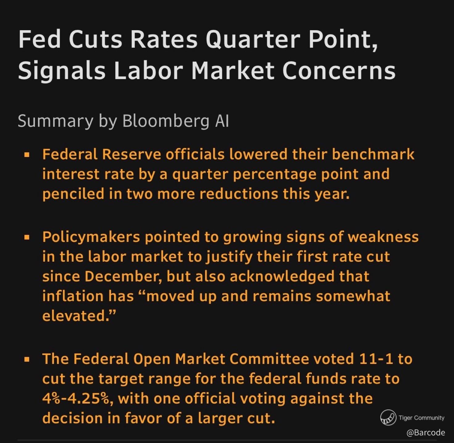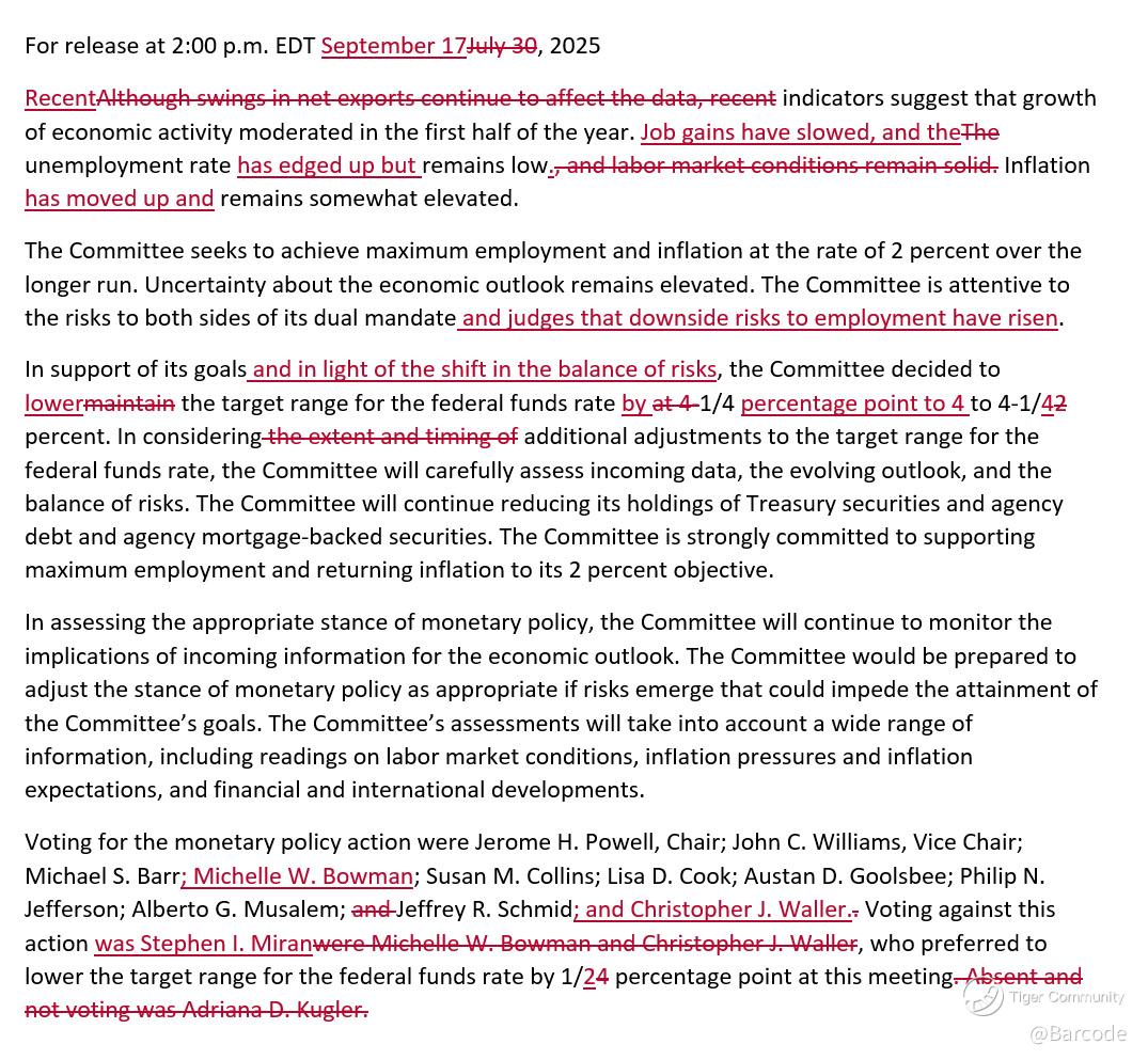 $SPDR S&P 500 ETF Trust(SPY)$ $S&P 500(.SPX)$ $iShares Russell 2000 ETF(IWM)$ I’m fully convinced this FOMC print is a defining pivot in the 2025 macro playbook. The Fed cut rates by 25 bps to 4.00%–4.25%, as expected, with Stephen L. Miran dissenting for a deeper 50 bps cut. This isn’t just a technical adjustment; it signals the beginning of a new policy glide path.