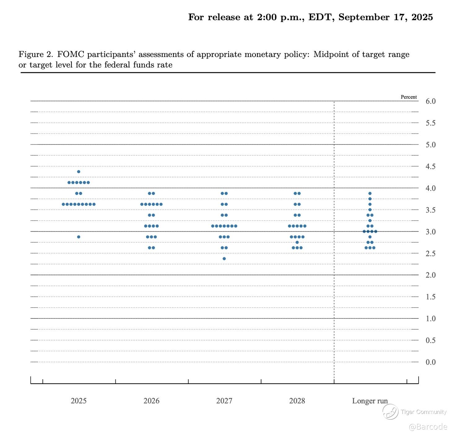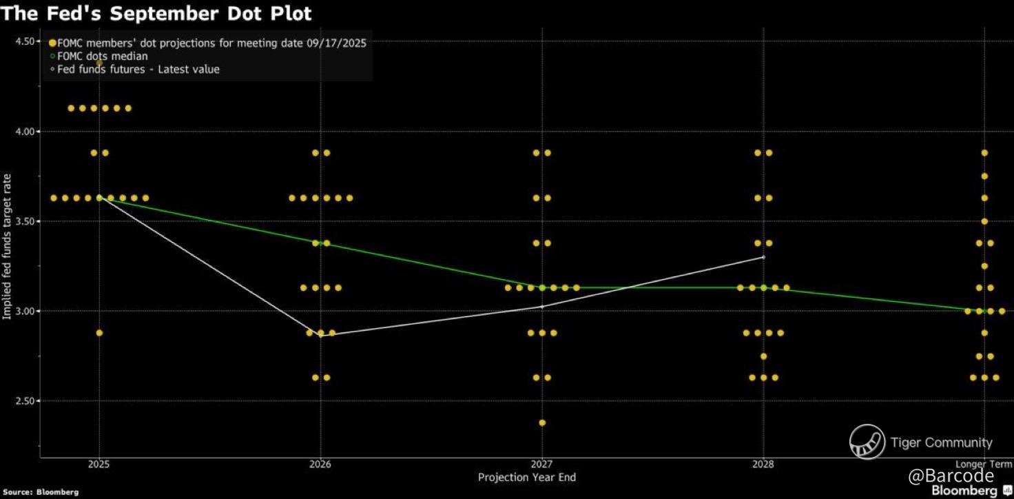 The visual shows the dots converging lower, aligning with Fed funds futures pricing, and confirming easing momentum into 2026.