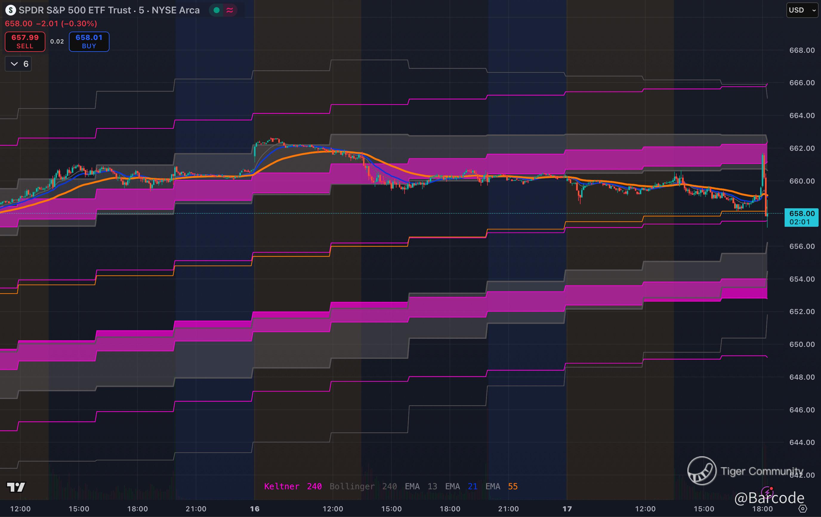 SPY hit the $657.74 dark pool level immediately post-Fed. The intraday chart shows high $662.65, low $657.13, and balancing at $657.85.