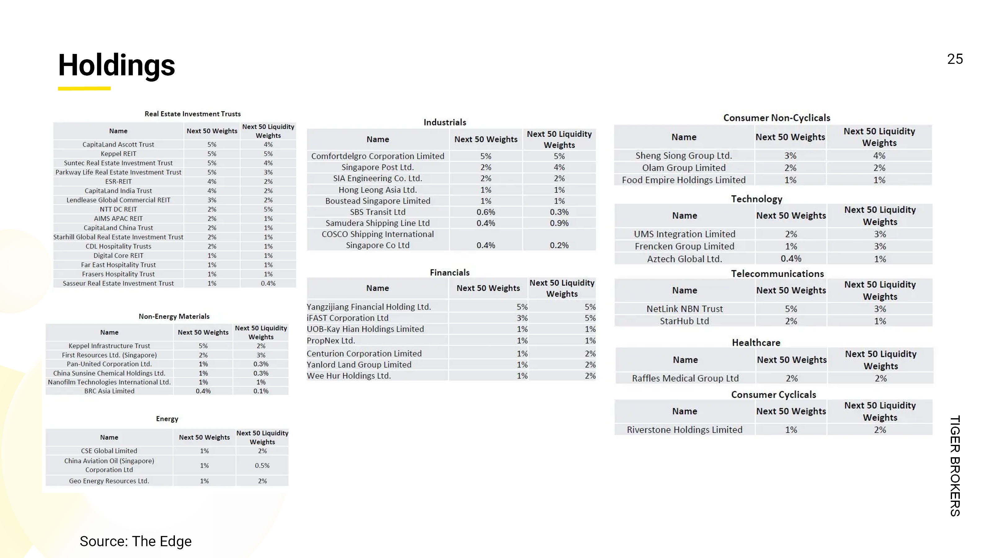 Mid-cap trait – median market cap only S$2.1 bn; although liquid, bid-ask spreads may widen in extreme conditions.