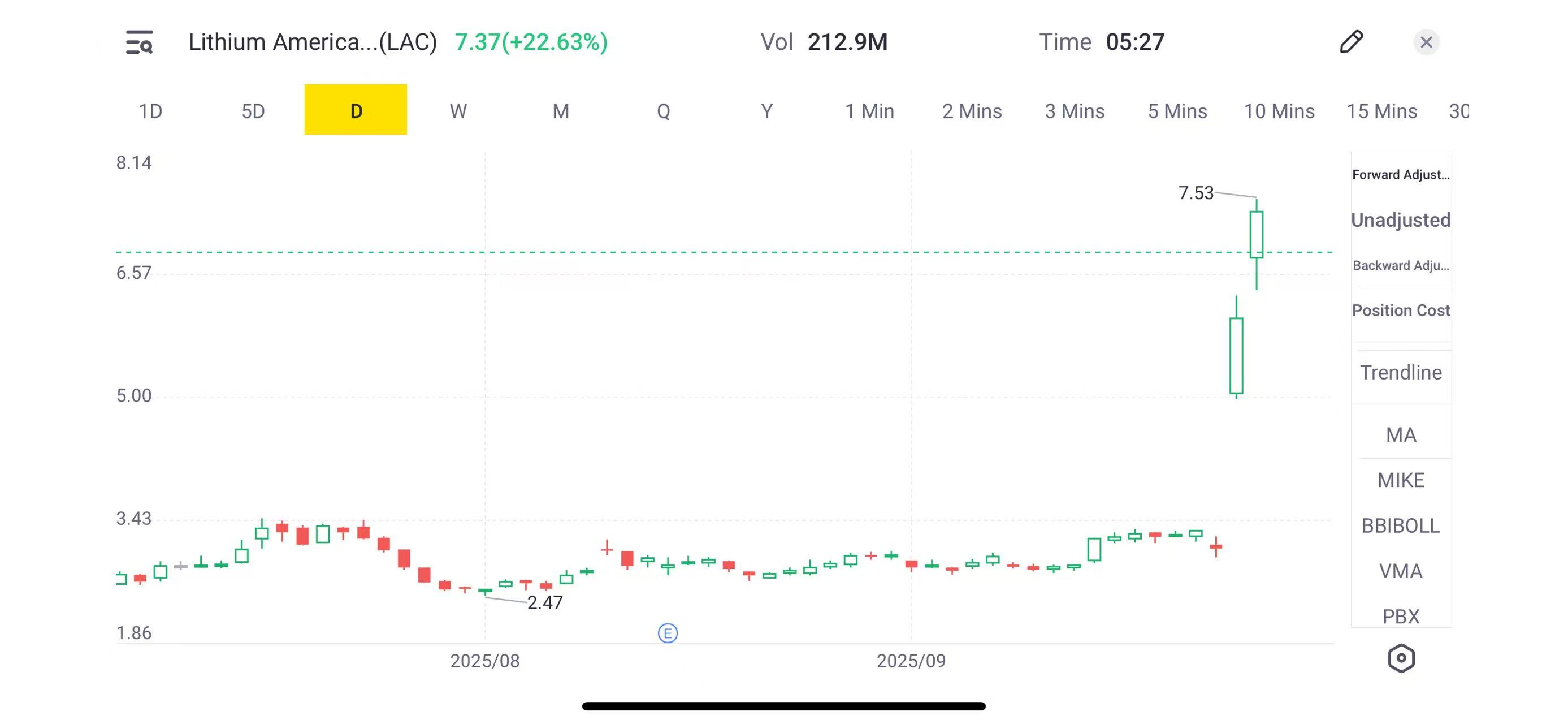 $Lithium Americas Corp.(LAC)$ has been on fire. The stock nearly doubled in just two trading days, with one day alone up almost 96%. The reason? A Reuters report that the Trump administration might revise a $2.3 billion Department of Energy loan to the company — and even take a 5%–10% equity stake. For a company worth less than $1 billion before the news, that was enough to send shares skyrocketing.