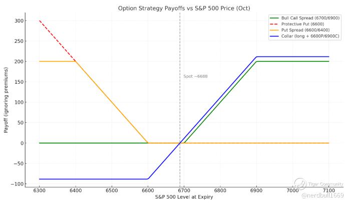 Protective Put (e.g., Buy 6,600P Oct expiry): Insurance against a sudden drop. Simple downside insurance — payoff rises if S&P falls below 6,600.