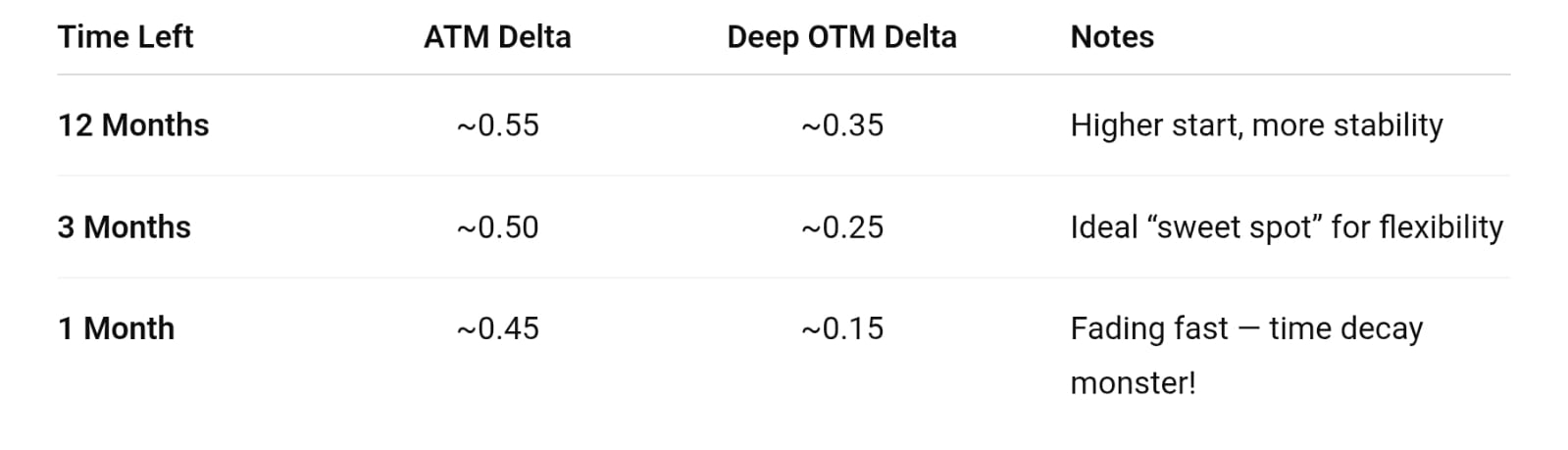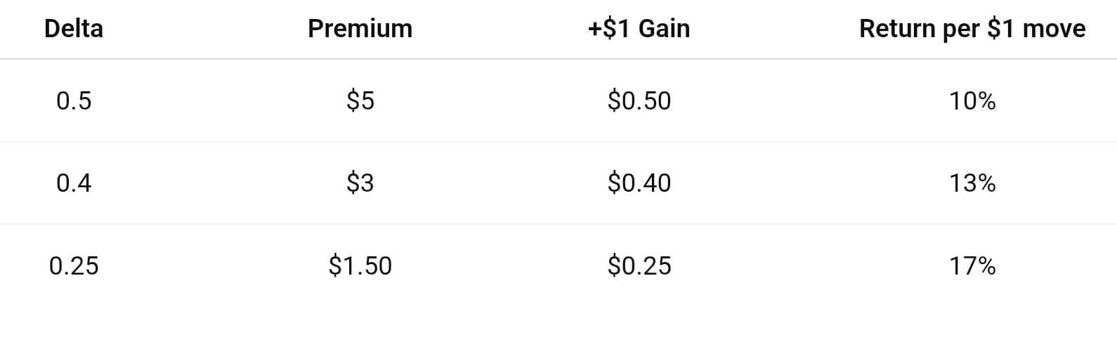 However, here's the juicy bit โ for every $1 up in the stock, your return amplifies with lower delta because those options are cheaper upfront.