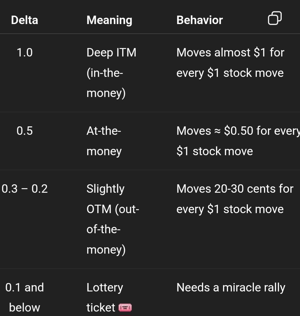 Think of delta as your options's mood swing ๐ โ it measures how much the options's price moves when the stock moves $1.