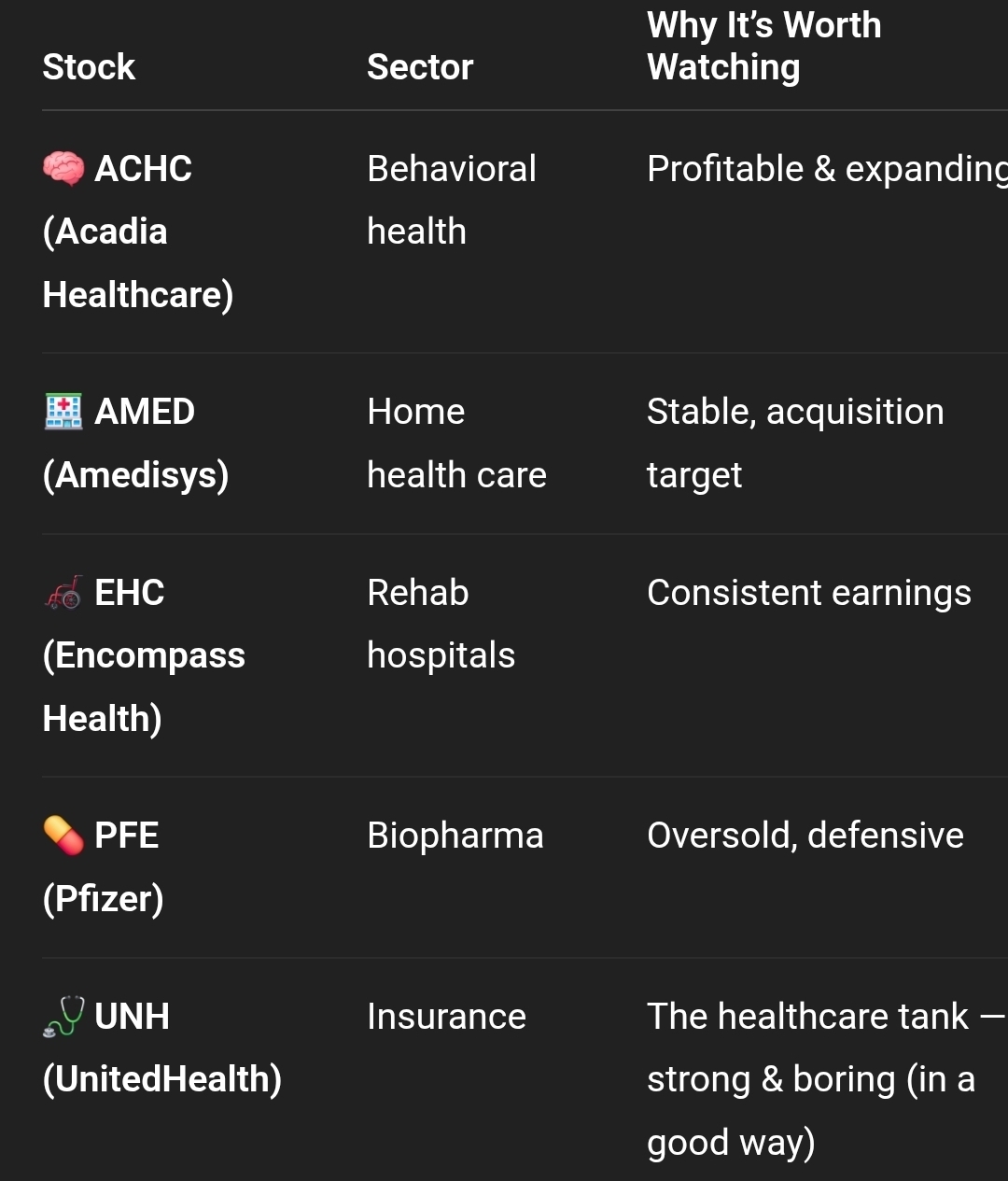 Companies like $Amedisys(AMED)$ (Amedisys), $Acadia Healthcare(ACHC)$ (Acadia Healthcare), $Encompass Health Corporation(EHC)$ (Encompass Health) — they bleed less when the market sneezes. 🤧