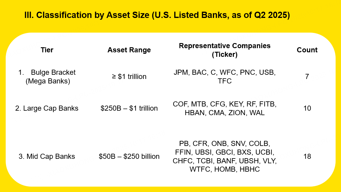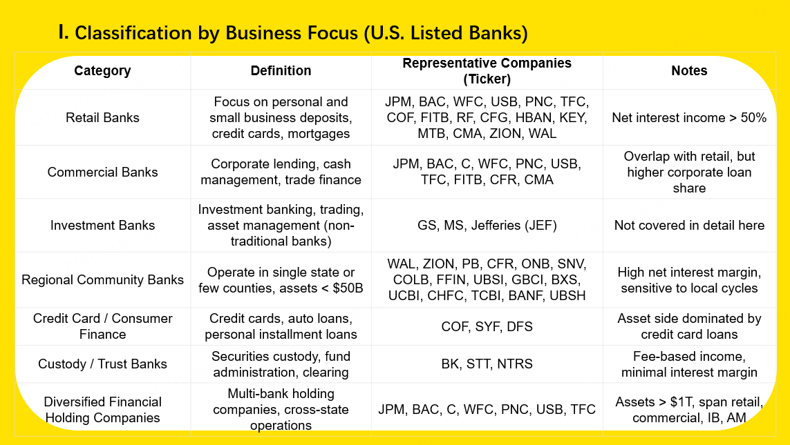 As of 16 Oct 2025 (U.S. ET), major bank stocks are systematically grouped by business focus, service region and asset size. Covers all NYSE/Nasdaq listed domestic and foreign-bank ADRs; excludes ETFs, REITs and pure investment banks (e.g., Goldman Sachs).
