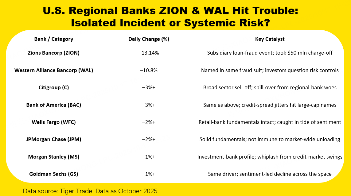 ( On16 Oct 2025) the U.S. bank patch stole the spotlight. Two “bad-loan bombs” detonated at once, sending the regional-bank index $KBW Regional Banking Index(KRX)$ down 6.2% – its biggest one-day drop since May. The Philadelphia Bank Index lost 3.6%, wiping out > USD 100 bn in market value and dragging the whole financial sector lower. Traders asked if this was systemic; Wall Street’s consensus is still “isolated risk”.