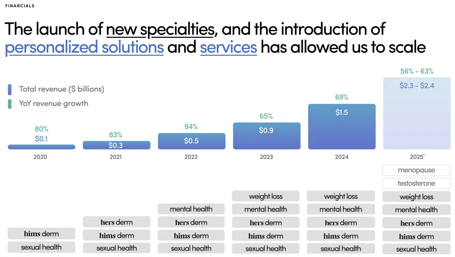 Until late in 2023, Hims & Hers had only three specialties — mental health, dermatology, and sexual health. After the recent launch of testosterone for the Hims app and menopause and perimenopause for the Hers app, the company is up to six specialties, and revenue has compounded more quickly as the number of specialties grows.
