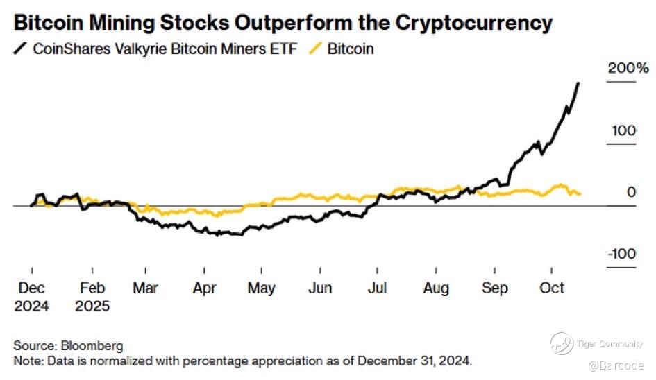 The data doesn’t lie; Bitcoin miners are crushing it. Bloomberg’s chart shows the CoinShares Valkyrie Bitcoin Miners ETF up nearly 200% since January 2025, while Bitcoin itself has barely moved. That’s not luck; it’s leverage. When BTC edges higher, miner margins explode because every $1,000 uptick in Bitcoin lifts profit potential exponentially.