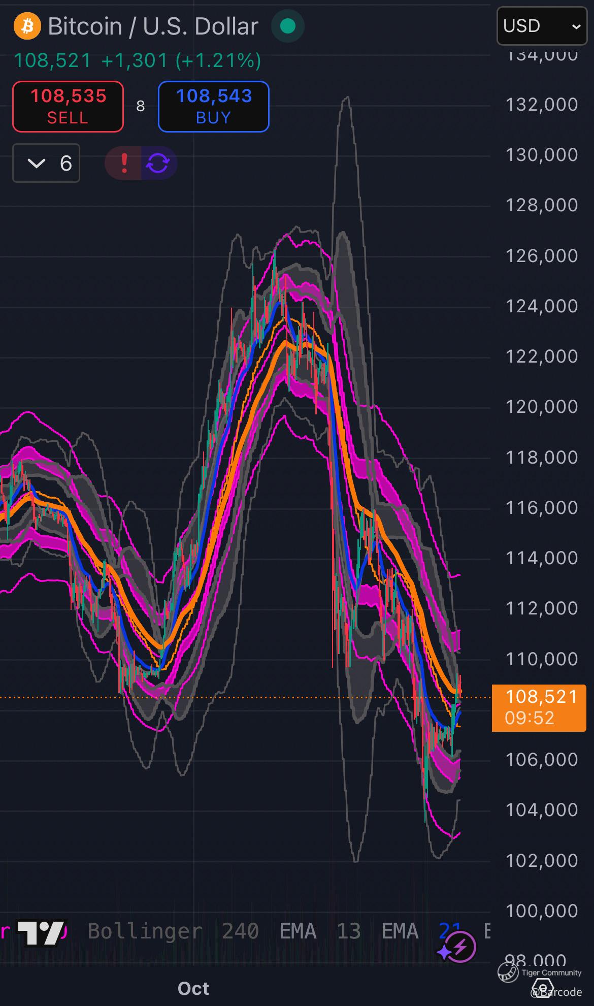 Bitcoin currently trades at $108,521, pressing against key resistance at $109,542 and $113,760. A decisive close above $113,760 could ignite a surge toward $120K–$123K. The chart structure shows classic compression with Bollinger and EMA convergence; volatility’s coiled and ready to unwind.