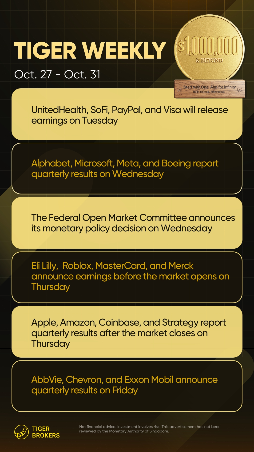 Mega-Cap Tech: The coming week marks the climax of the Q3 earnings season, with Big Tech giants Microsoft (MSFT), Amazon (AMZN), Apple (AAPL), Alphabet (GOOG), and Meta (META) all set to release results. These reports will be a litmus test for the sustainability of the AI-driven rally that has dominated markets in 2025. Investors will focus on cloud growth, AI monetization progress, and forward guidance — key drivers of sector momentum.