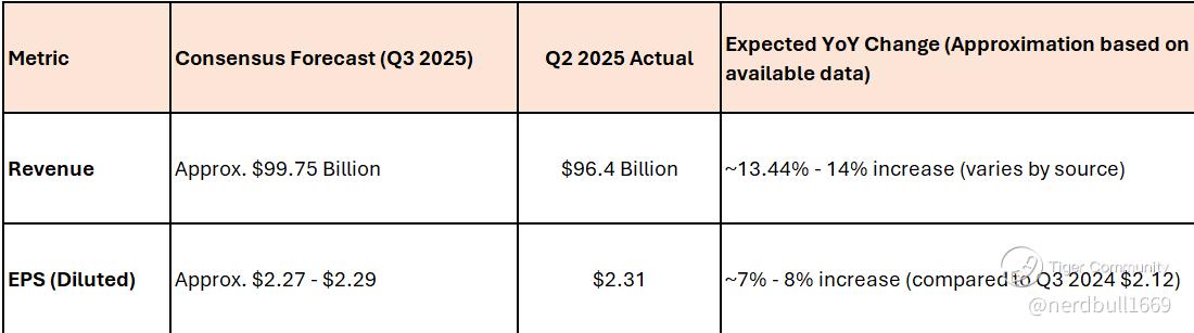 Current consensus expectations for Q3 2025 are generally pointing toward continued revenue growth, primarily driven by the strength of Google Services (Search and YouTube) and significant expansion in Google Cloud, though there is a forecast for a slight decline in Earnings Per Share (EPS) quarter-over-quarter due to heavy investment.