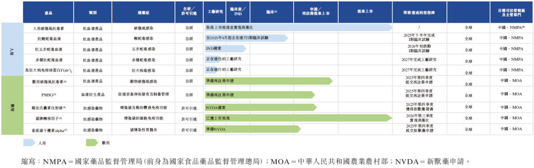 除人用TAT外,江西生物的現有產品包括獸用破傷風抗毒素、孕馬血清促性腺激素(PMSG)以及若干用於補充或支持PMSG治療的激素類藥物,這些產品將在完成上市批准的重新註冊後投放市場。公司還建立了針對高潛力市場分部的創新產品管線,包括豐富的人用抗蛇毒血清、馬狂犬病免疫球蛋白F(ab')2及多種獸用抗感染藥物。