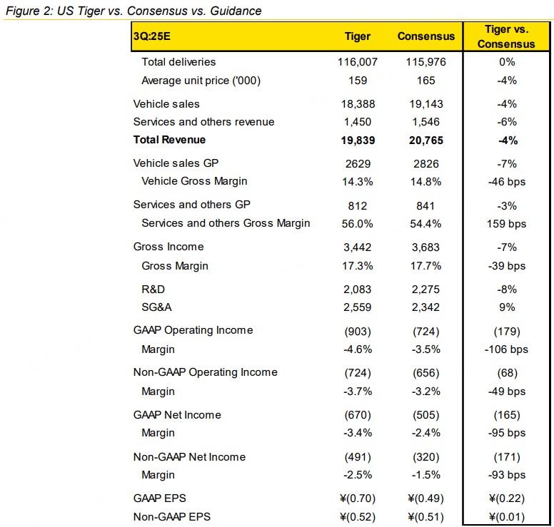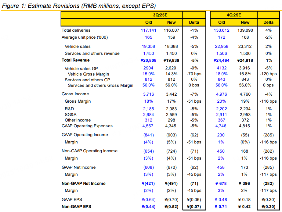 While XPeng’s 3Q vehicle deliveries are trimmed slightly (–1% to ~116K units) to align with recent disclosures, the team cuts the average selling price (ASP) by 4% due to a heavier mix of lower-priced models and promotional activity. As a result, 3Q vehicle sales are reduced by 5%, and vehicle gross margin is revised down 70bps to 14.3%.
