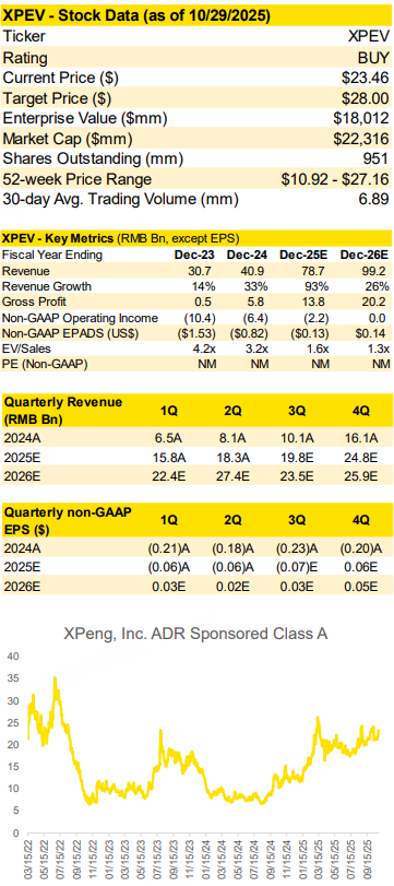 Valuation remains unchanged at 1.6× ’26E sales, still a steep discount to Tesla’s 14.5× multiple—partly reflecting XPeng’s earlier stage of development and broader geopolitical risks facing U.S.-listed Chinese EV makers.