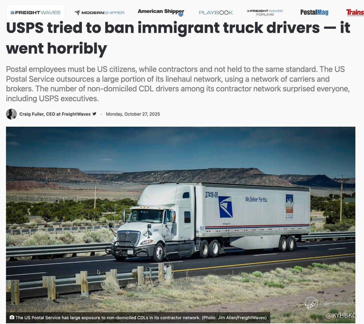 Screenshot of a FreightWaves article titled USPS tries to ban immigrant truck drivers with details on policy differences for employees and contractors, including a photo of a white USPS semi-truck with blue eagle logo driving on a highway near desert landscape, and text about outsourcing linehaul work via brokers and carriers.