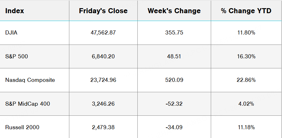 U.S. stocks ended mixed last week. Large-cap tech names led gains on AI optimism, lifting the Nasdaq. Market breadth was narrow as the S&P 500 rose even though most sectors fell, while an equal-weighted index underperformed. Nvidia’s market cap briefly surpassed USD 5 trillion.