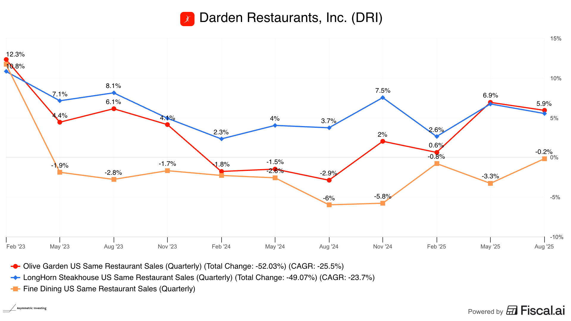 But people are willing to spend more to go to a steakhouse…which seems contradictory to the struggling consumer narrative. And not every steakhouse is improving, as we see with Darden’s “fine dining” segment in decline.