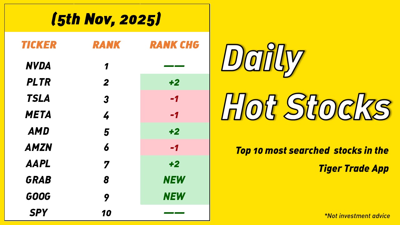 Top 10: NVIDIA, Tesla Motors, Amazon.com, Palantir Technologies Inc., Meta Platforms, Inc., Apple, Beyond Meat, Inc., SoFi Technologies Inc., Cboe Volatility Index, Grab Holdings