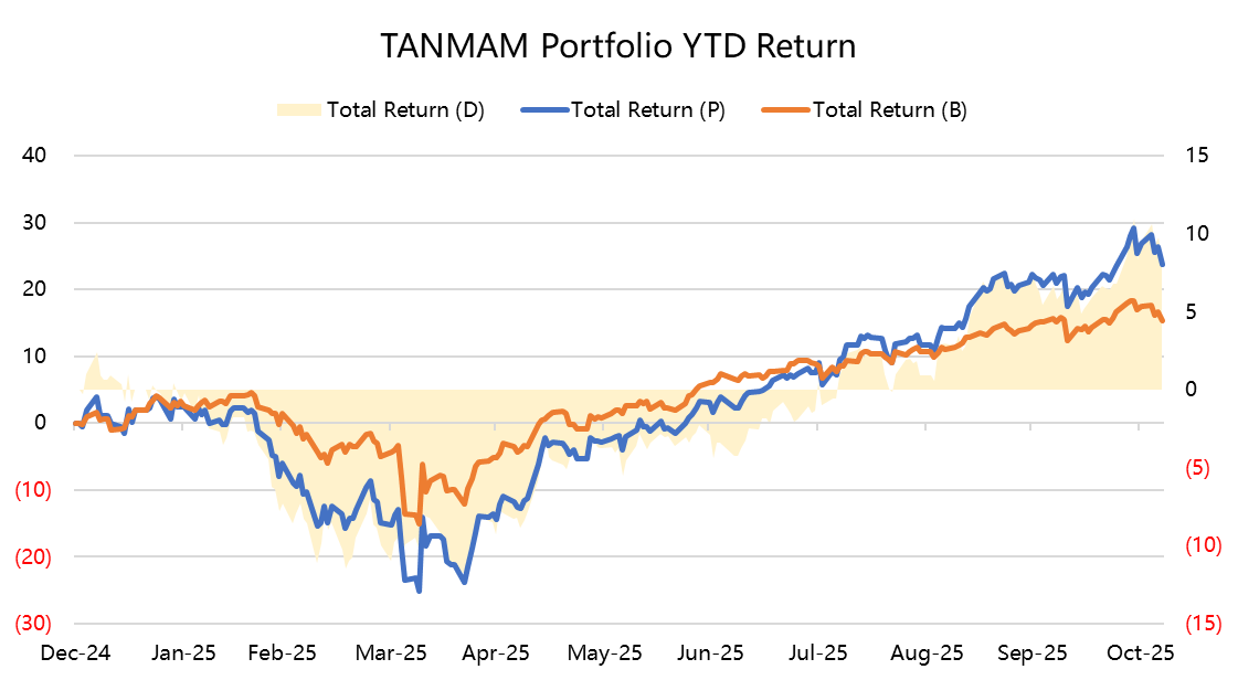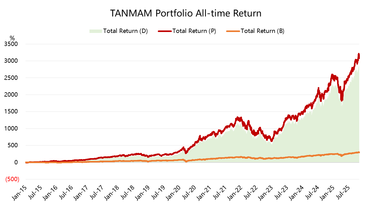 The so-called “TANMAMG” equal-weight Big Tech portfolio—tracking the Magnificent Seven (TSLA, AAPL, NVDA, META, AMZN, MSFT, GOOGL)—continues to outperform the S&P 500 by a wide margin.