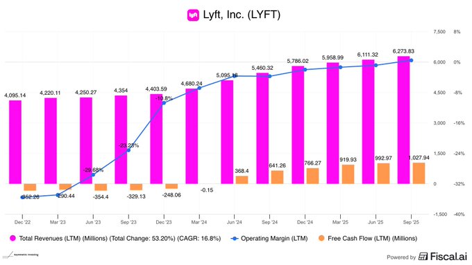 Line chart titled LYFT displays purple line for revenue in millions rising from 4.014 in Mar 23 to 7.027 in Sep 24, orange line for operating margin percentage fluctuating from -4.3 to 7.8, and another purple line for free cash flow in millions increasing from -0.34 to 227.
