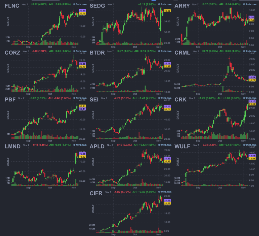$Fluence Energy, Inc.(FLNC)$ $SolarEdge(SEDG)$ $Array Technologies Inc.(ARRY)$ $Core Scientific, Inc.(CORZ)$ $Bitdeer Technologies Group(BTDR)$ $CRITICAL METALS CORPORATION(CRML)$ $PBF Energy Inc(PBF)$ $Solaris Energy Infrastructure, Inc.(SEI)$ $Comstock Resources(CRK)$ $Lemonade, Inc.(LMND)$ $APPLIED DIGITAL CORP(APLD)$ $TeraWulf Inc.(WULF)$ $Cipher Mining Inc.(CIFR)$