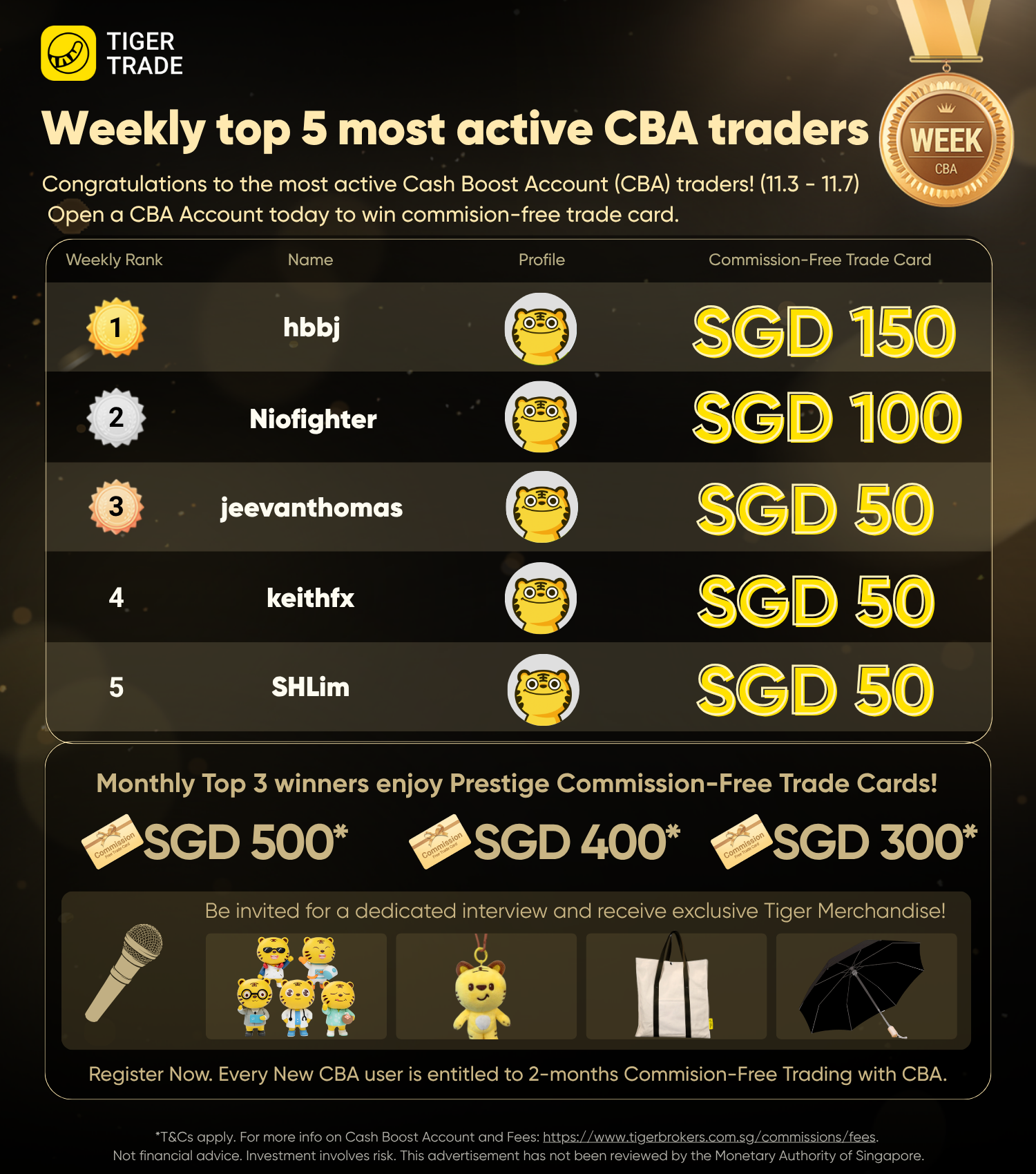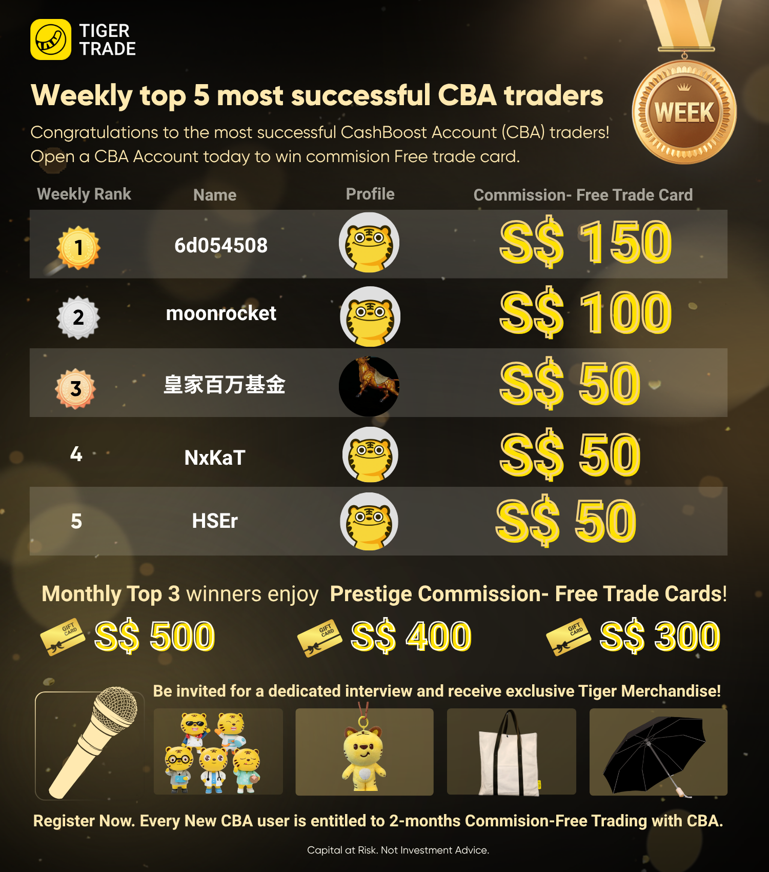 Welcome to open a CBA today and enjoy access to a trading limit of up to SGD 20,000 with upcoming 0-commission, unlimited trading on SG, HK, and US stocks, as well as ETFs. Find out more here.