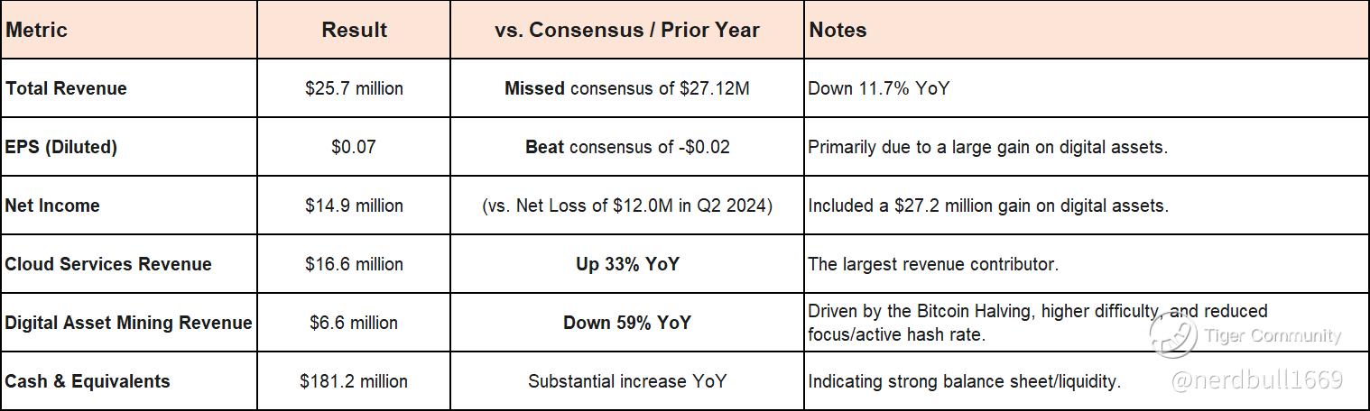 The key takeaway from the financial results is the sharp decline in Bitcoin mining revenue, which was intentionally offset by the growing contribution from Cloud Services revenue, validating the company's diversification efforts. The significant Net Income and EPS beat were largely attributed to a one-time gain on digital assets, rather than operating profit.