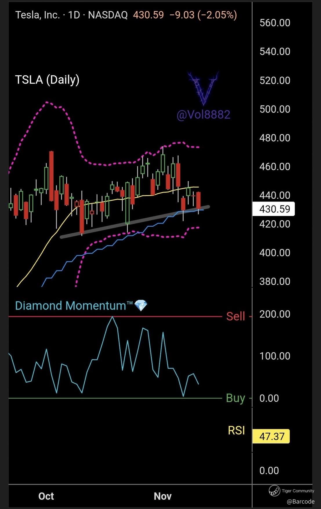 $Tesla Motors(TSLA)$ $Direxion Daily TSLA Bull 2X Shares(TSLL)$ $NVIDIA(NVDA)$ π₯β‘ $TSLA is smashing straight into the 430 killzone, magnet locked to that ascending blade trendline. Price is still holding above the medium term MA, and this level has been a proven launchpad for powerful expansions. This is where conviction gets tested and where silent accumulation often reveals itself.