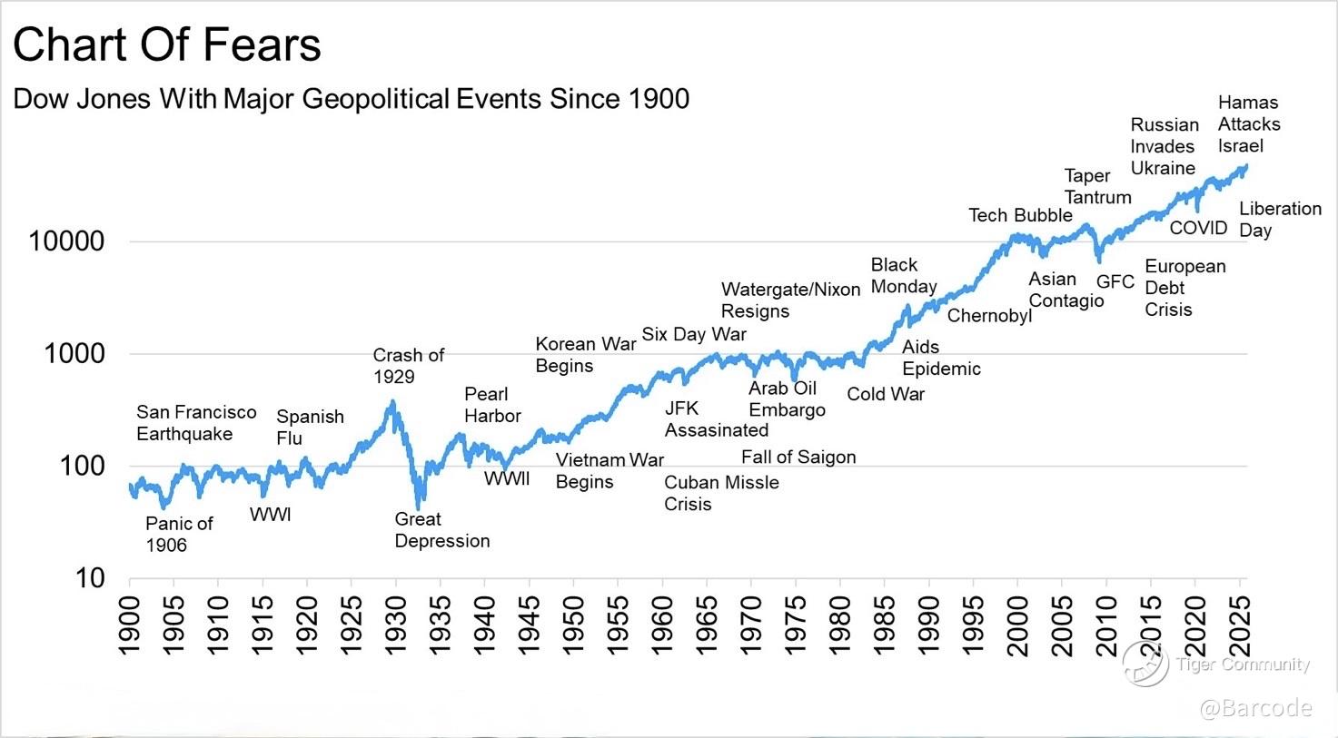 The Dow clearing 1,615 is not simply a milestone, it is a message. For more than a century, markets have absorbed every geopolitical shock and every so-called βend of the worldβ headline, only to emerge stronger on the other side. The updated Chart of Fears captures this with clinical clarity. From the Panic of 1906 to COVID and the current geopolitical environment, the pattern remains unchanged. Fear dominates the moment, compounding dominates history.