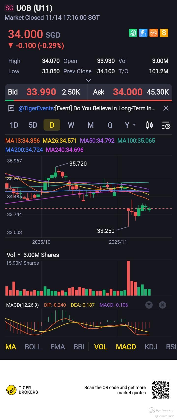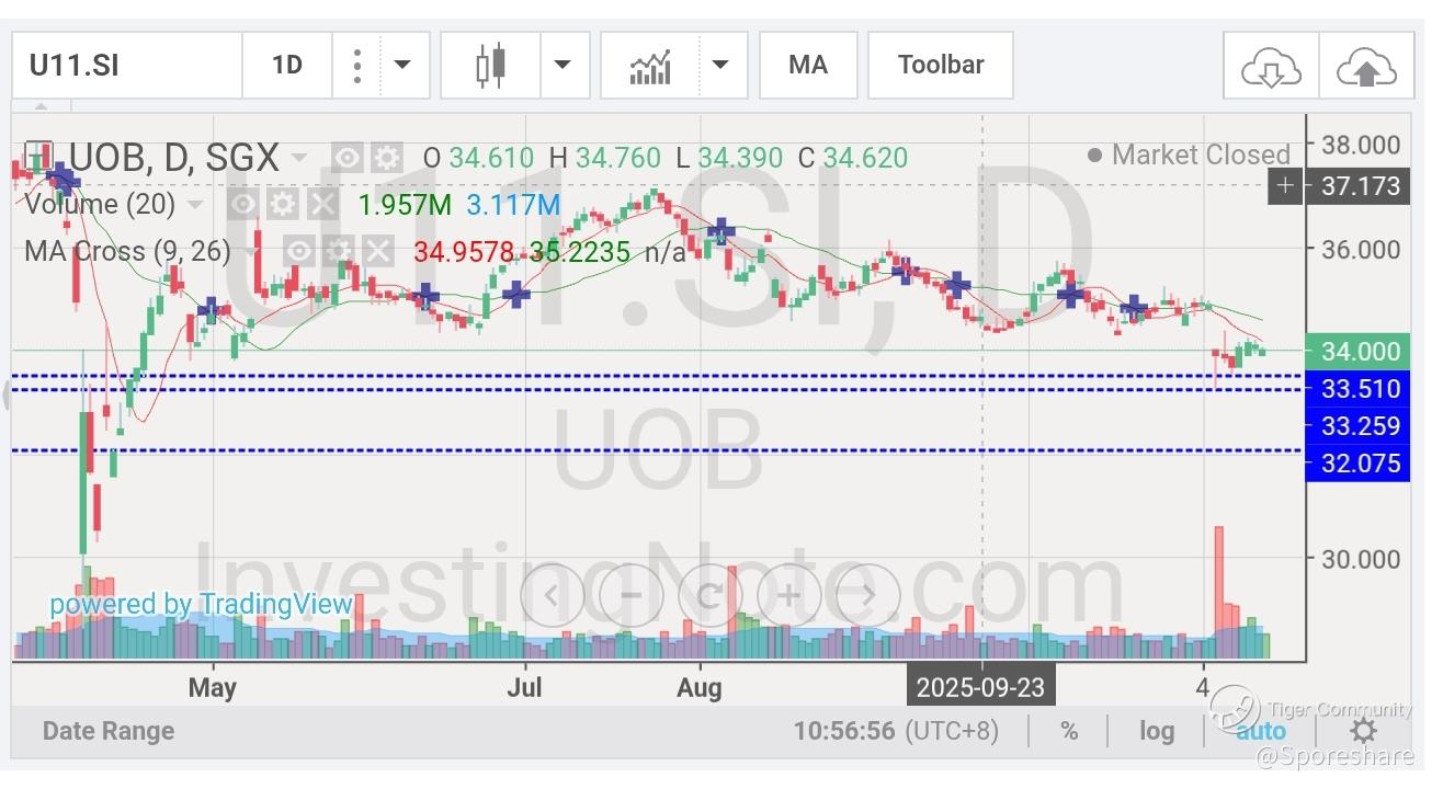 Uob Bank - The company has bought back 240k share yesterday, looks like the price may rebound to test 34.37 and cover the Gapped at 34.80!