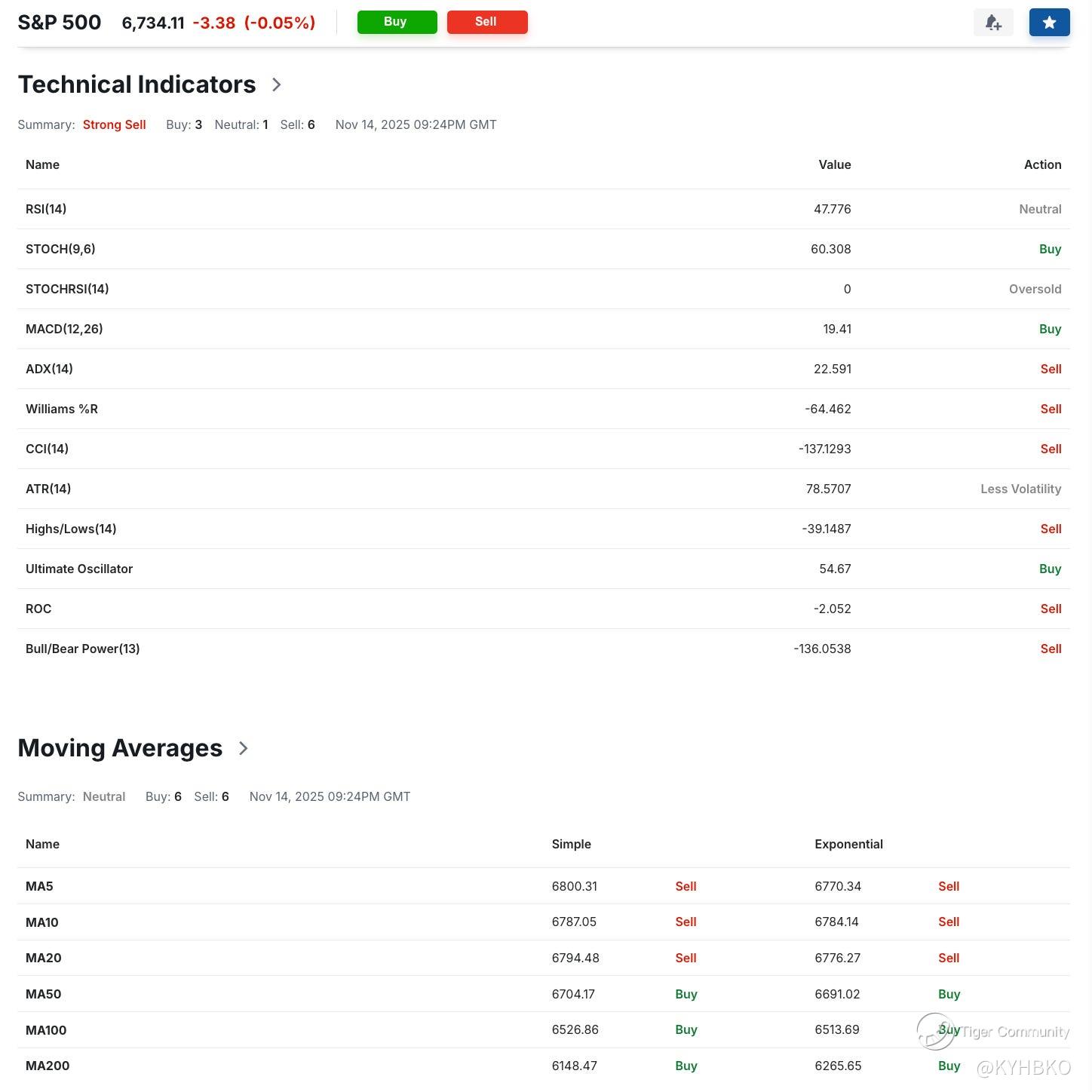 Upon review of the daily interval, technical indicators present a mixed outlook for the S&P 500. Out of 21 total indicators, 9 currently signal a “Buy” rating, while 12 suggest a “Sell” rating. This split highlights ongoing uncertainty in market sentiment.