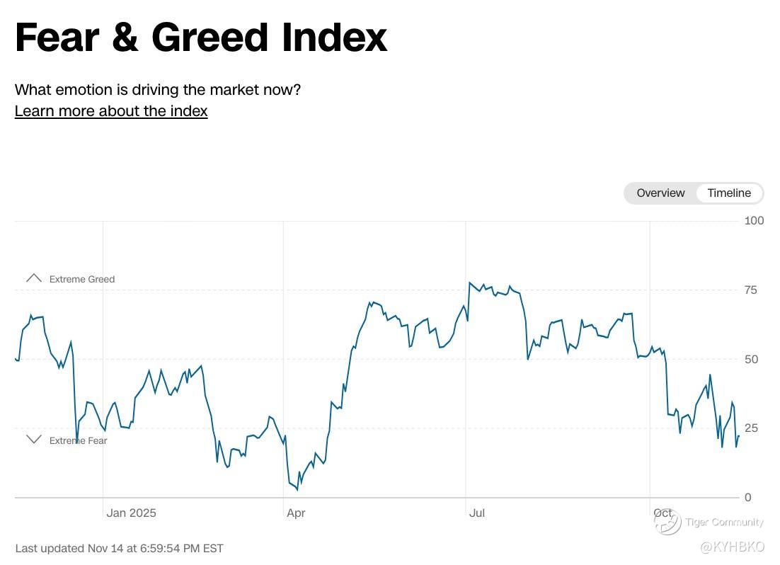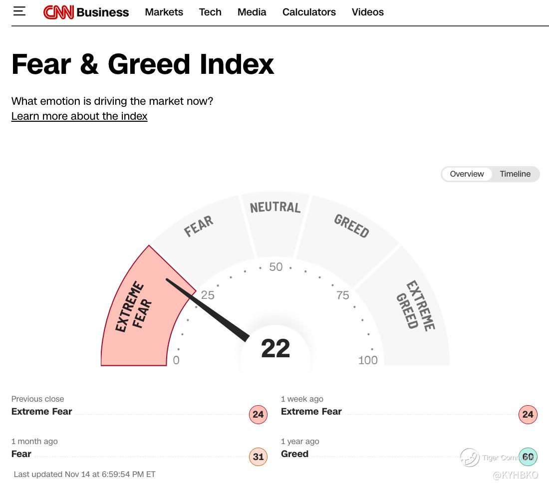 The CNN Fear & Greed Index, as of 14th November, shows 22, which indicates a state of extreme fear in the market. This current reading represents a deterioration compared to the previous closing figure, which was also categorised as extreme fear but slightly higher at 24.