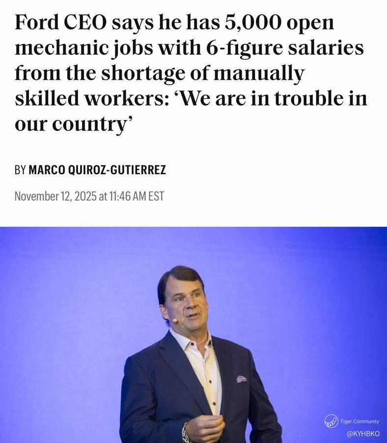 Ford’s CEO Jim Farley just dropped a stat that should make every politician sweat: 5,000 open mechanic jobs. 6-figure salaries. 0 takers. - Mario Nawfal