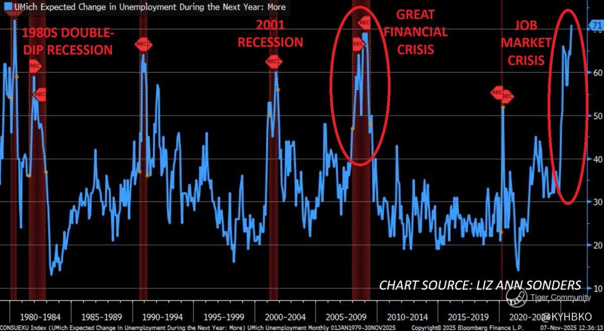 Currently, 71% of US consumers expect HIGHER UNEMPLOYMENT over the next 12 months, the highest share since the 1980s recession peak. This is now even higher than during the 2008 Financial Crisis peak. - X user Global Markets Investor