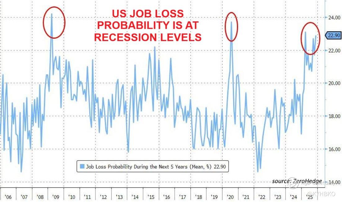 US job loss probability is at RECESSION levels: The perceived probability of job loss among US consumers hit 23% in November, the 3rd-highest since the FINANCIAL CRISIS peak. This is a 7 percentage points rise this year. The pessimism about the job market is EXTREMELY high. - X user Global Markets Investor